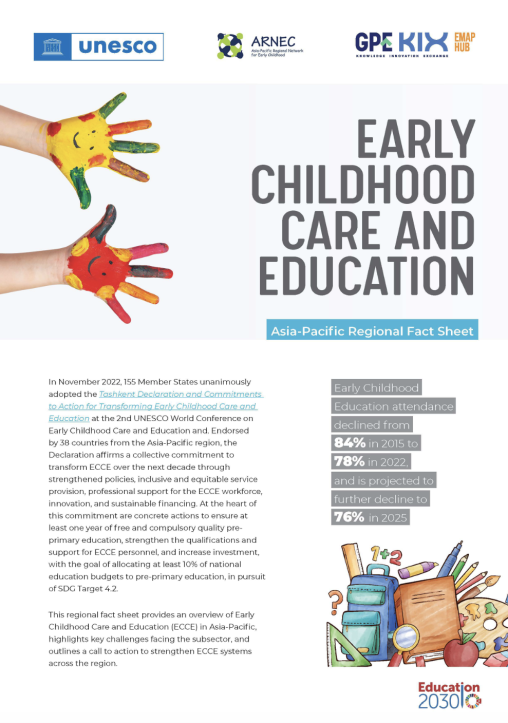 22 Jul 2025 Early Childhood Care and Education in Asia-Pacific: Regional Fact Sheet provides a concise overview of the status, trends, and challenges facing early childhood care and education (ECCE across the region). Drawing on the latest available data, the fact sheet highlights declining participation in pre-primary education, persistent inequalities in access and quality, shortages of qualified ECCE personnel, and increasing pressures from climate-related risks. It also presents evidence on the long-term benefits of ECCE and outlines a clear call to action for governments and partners to increase investment, strengthen the ECCE workforce, improve data systems, and promote inclusive, climate-responsive ECCE policies, in line with SDG Target 4.2 and the Education 2030 Agenda.