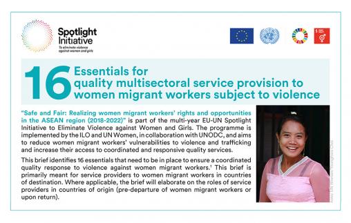 20 Jan 2020 “Safe and Fair: Realizing women migrant workers’ rights and opportunities in the ASEAN region (2018-2022)” is part of the multi-year EU-UN Spotlight Initiative to Eliminate Violence against Women and Girls. The programme is implemented by the ILO and UN Women, in collaboration with UNODC, and aims to reduce women migrant workers’ vulnerabilities to violence and trafficking and increase their access to coordinated and responsive quality services. This brief identifies 16 essentials that need to be in place to ensure a coordinated quality response to violence against women migrant workers. This brief is primarily meant for service providers to women migrant workers in countries of destination. Where applicable, the brief will elaborate on the roles of service providers in countries of origin (pre-departure of women migrant workers or upon return).