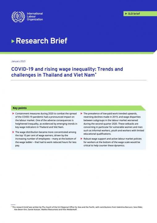 27 Jan 2021 This brief presents quantitative trends in wage inequality in Thailand and Viet Nam during the COVID-19 crisis in 2020. Based on various measures, it highlights the rise of inequality as wages have been increasingly concentrated among the highest wage earners and the disproportionate impact of lower wages on informal workers, youth and workers with lower educational qualifications. It presents a number of policy measures including enhanced wage support and active labour market policies to counter these dynamics.