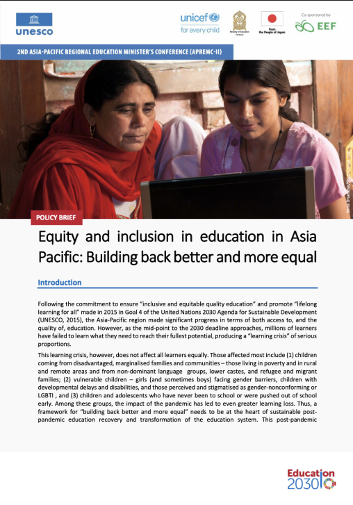 05 Jun 2022 Equity and Inclusion in Education in Asia-Pacific: Building Back Better and More Equal is a policy brief developed for the 2nd Asia-Pacific Regional Education Ministers’ Conference (APREMC-II). It examines how the COVID-19 pandemic has deepened existing inequalities in education across the region, particularly for marginalized and vulnerable learners. The brief highlights key challenges, good practices from Asia-Pacific countries, and priority policy actions to support learning recovery and longer-term transformation of education systems towards greater equity, inclusion, and resilience, in line with SDG 4 and the Education 2030 Agenda.