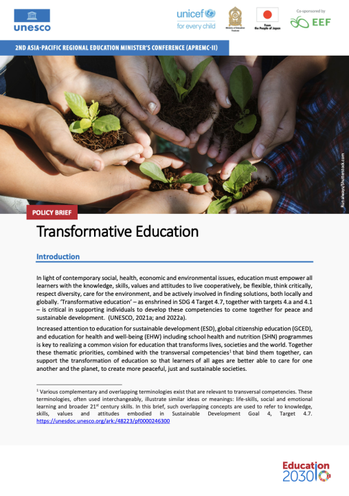 05 Jun 2022 Transformative Education is a policy brief prepared for the 2nd Asia-Pacific Regional Education Ministers’ Conference (APREMC-II). It highlights the role of education in equipping learners with the knowledge, skills, values, and attitudes needed to address contemporary social, environmental, health, and economic challenges. Focusing on education for sustainable development (ESD), global citizenship education (GCED), and education for health and well-being, the brief examines key challenges in the Asia-Pacific region and proposes priority actions for learning recovery and longer-term transformation of education systems, in line with SDG 4, particularly Target 4.7.