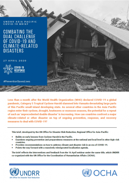 27 Apr 2020 Less than a month after the World Health Organization (WHO) declared COVID-19 a global pandemic, Category 5 Tropical Cyclone Harold slammed into Vanuatu devastating large parts of this Pacific small island developing state. As several other countries in the Asia-Pacific region enter their cyclone, drought, heatwaves or monsoon seasons, the potential for a repeat of such an ‘unprecedented double disaster’ is increasing. How can countries confront a major climate-related or other disasters on top of ongoing prevention, response, and recovery measures to deal with COVID-19? This brief, developed by the UN Office for Disaster Risk Reduction, Regional Office for Asia-Pacific: Builds on early lessons from Cyclone Harold in the Pacific. Examines ongoing prevention and preparedness measures at the national and local level in other high-risk countries. Provides recommendations on how to address climate and disaster risk in an era of COVID-19. Points the way forward with a massively reinvigorated localization agenda. The brief reflects the interventions and feedback from the 16 April webinar under the same title, which UNDRR co-organized with the UN Office for the Coordination of Humanitarian Affairs (OCHA).