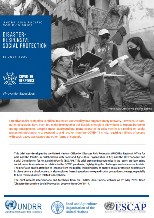 16 Jul 2020 Effective social protection is critical to reduce vulnerability and support timely recovery. However, to date, national systems have been too underdeveloped or not flexible enough to allow them to expand before or during emergencies. Despite these shortcomings, many countries in Asia-Pacific are relying on social protection mechanisms to respond to and recover from the COVID-19 crisis, reaching millions of people with cash-based assistance and other forms of support. This brief was developed by the United Nations Office for Disaster Risk Reduction (UNDRR), Regional Office for Asia and the Pacific, in collaboration with Food and Agriculture Organization (FAO) and the UN Economic and Social Commission for Asia and the Pacific (ESCAP). This brief explores how countries in the region are leveraging social protection systems in relation to the COVID-19 pandemic, highlighting the challenges and successes to date. The brief also draws attention to lessons from the region, including how to ensure social protection systems are in place before a shock occurs. It also explores financing options to expand social protection coverage, especially to help reduce disaster-related vulnerability. The brief reflects interventions and feedback from the UNDRR Asia-Pacific webinar on 28 May 2020, titled ‘Disaster-Responsive Social Protection: Lessons from COVID-19.’