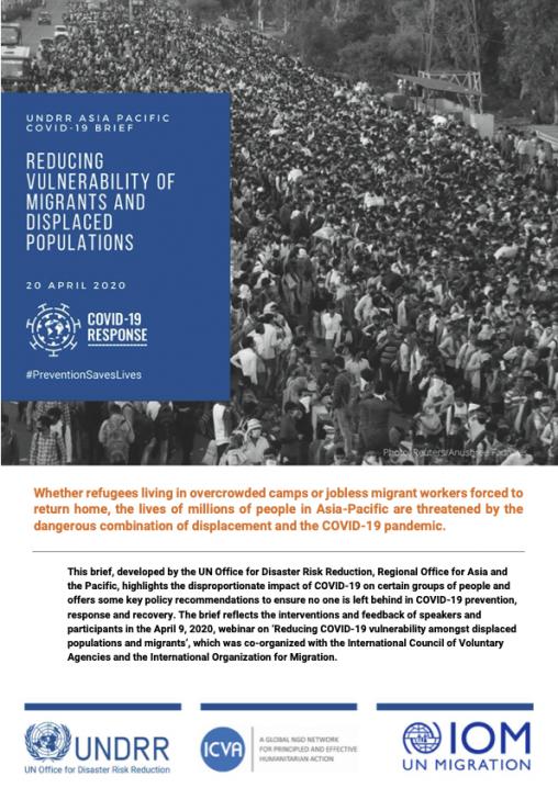 20 Apr 2020 Whether refugees living in overcrowded camps or jobless migrant workers forced to return home, the lives of millions of people in Asia-Pacific are threatened by the dangerous combination of displacement and the COVID-19 pandemic. This brief, developed by the UN Office for Disaster Risk Reduction, Regional Office for Asia and the Pacific, highlights the disproportionate impact of COVID-19 on certain groups of people and offers some key policy recommendations to ensure no one is left behind in COVID-19 prevention, response and recovery. The brief reflects the interventions and feedback of speakers and participants in the April 9, 2020, webinar on Reducing COVID-19 vulnerability amongst displaced populations and migrants, co-organized with the International Council of Voluntary Agencies and the International Organization for Migration.